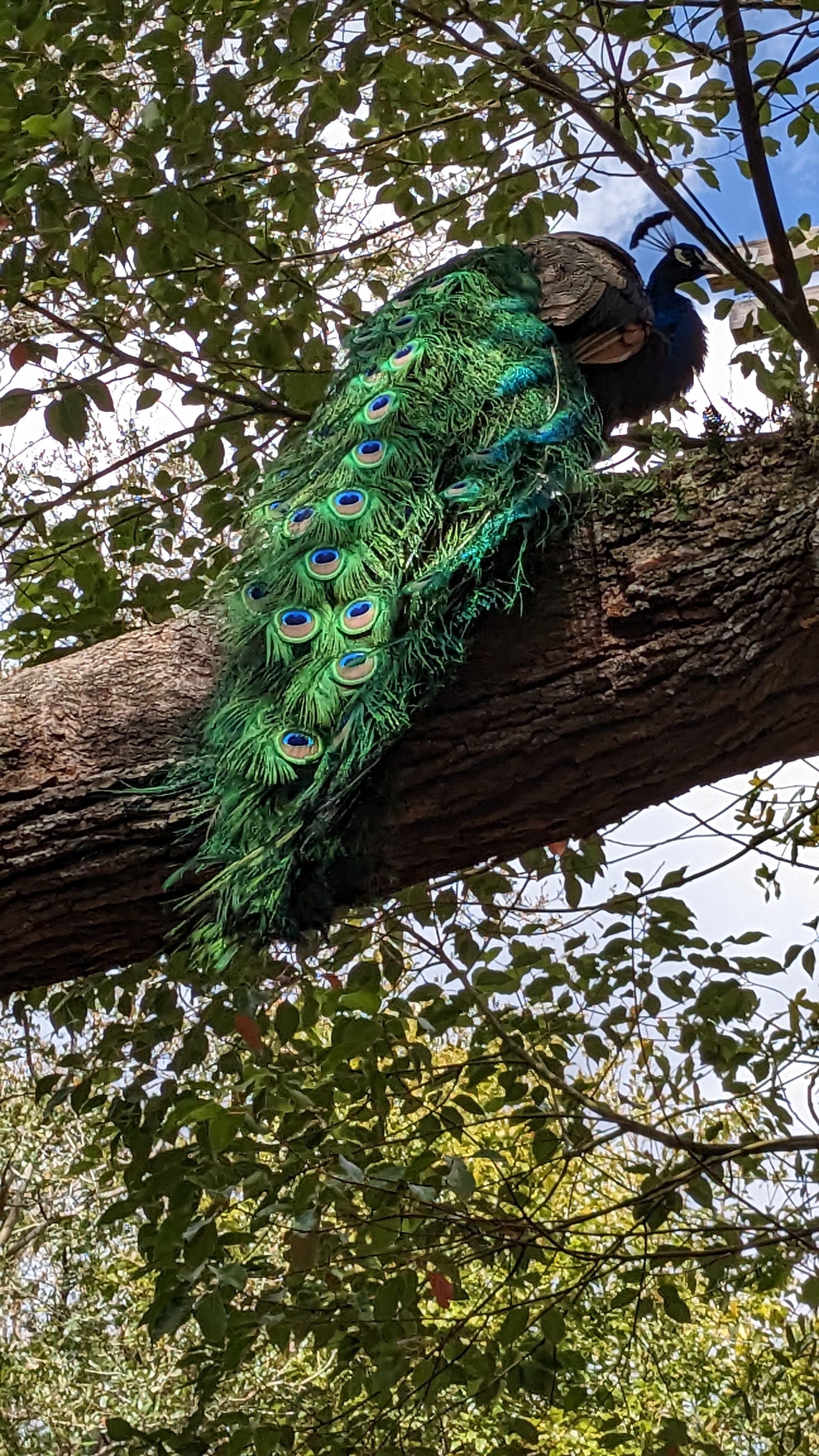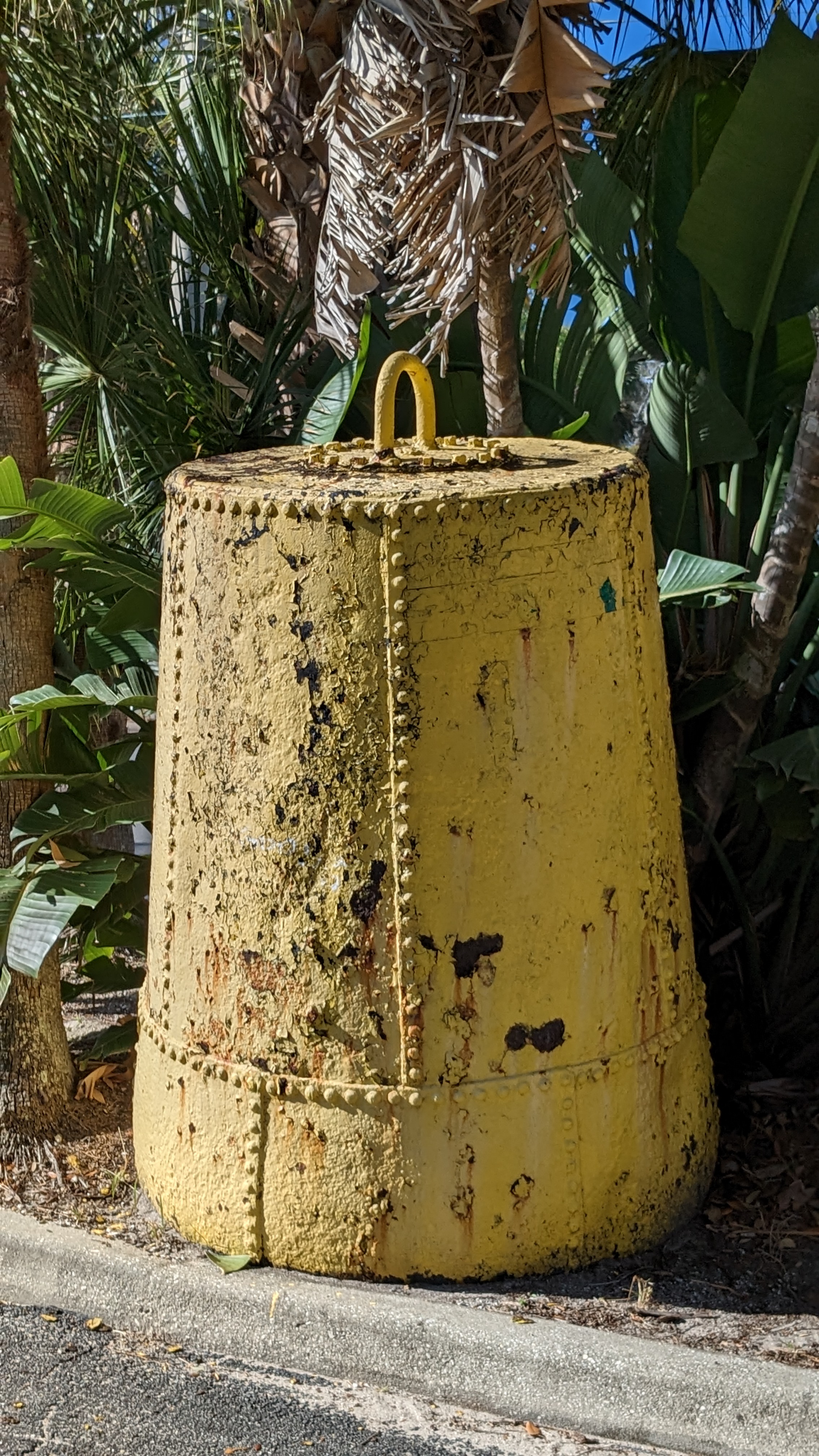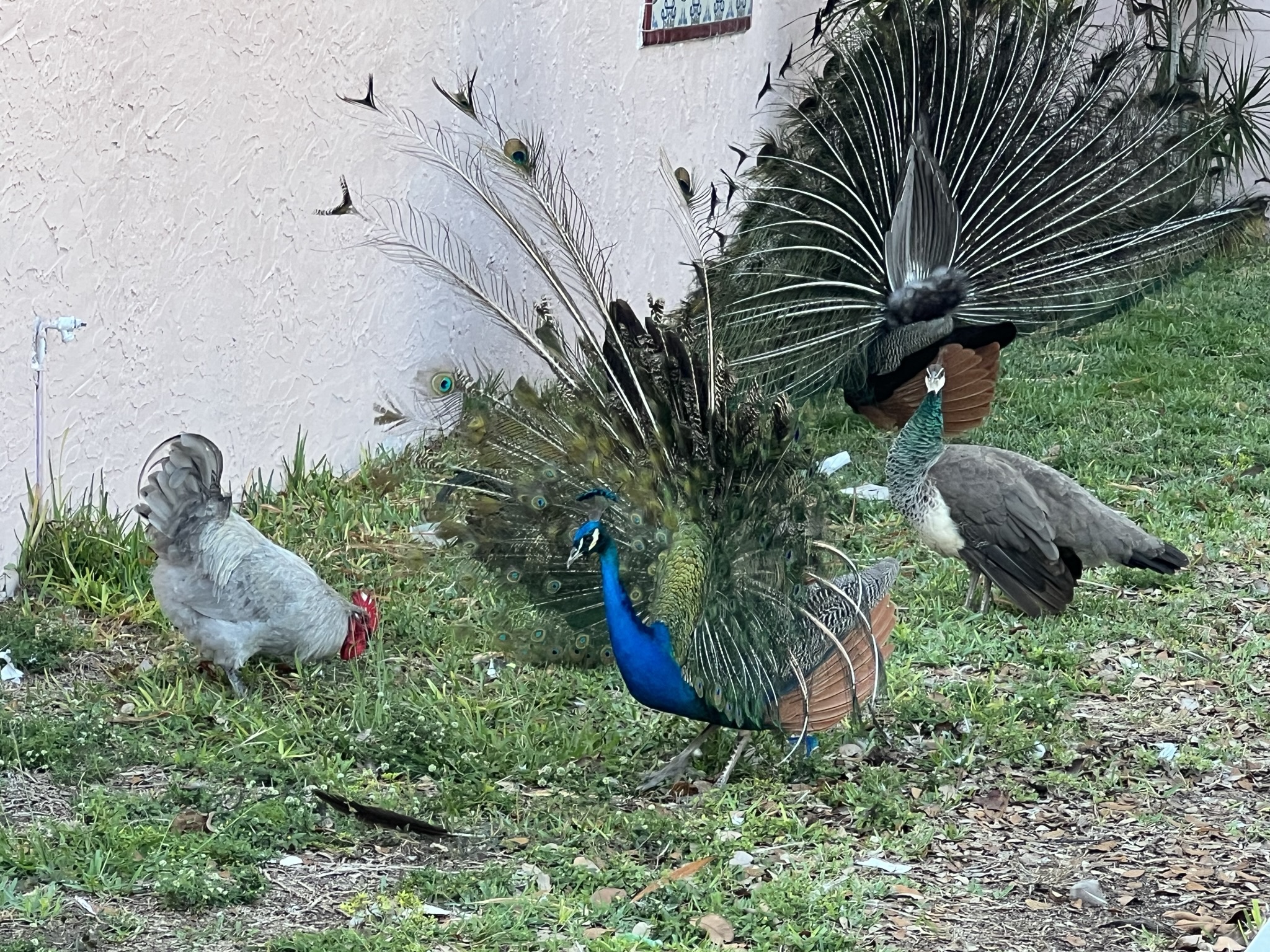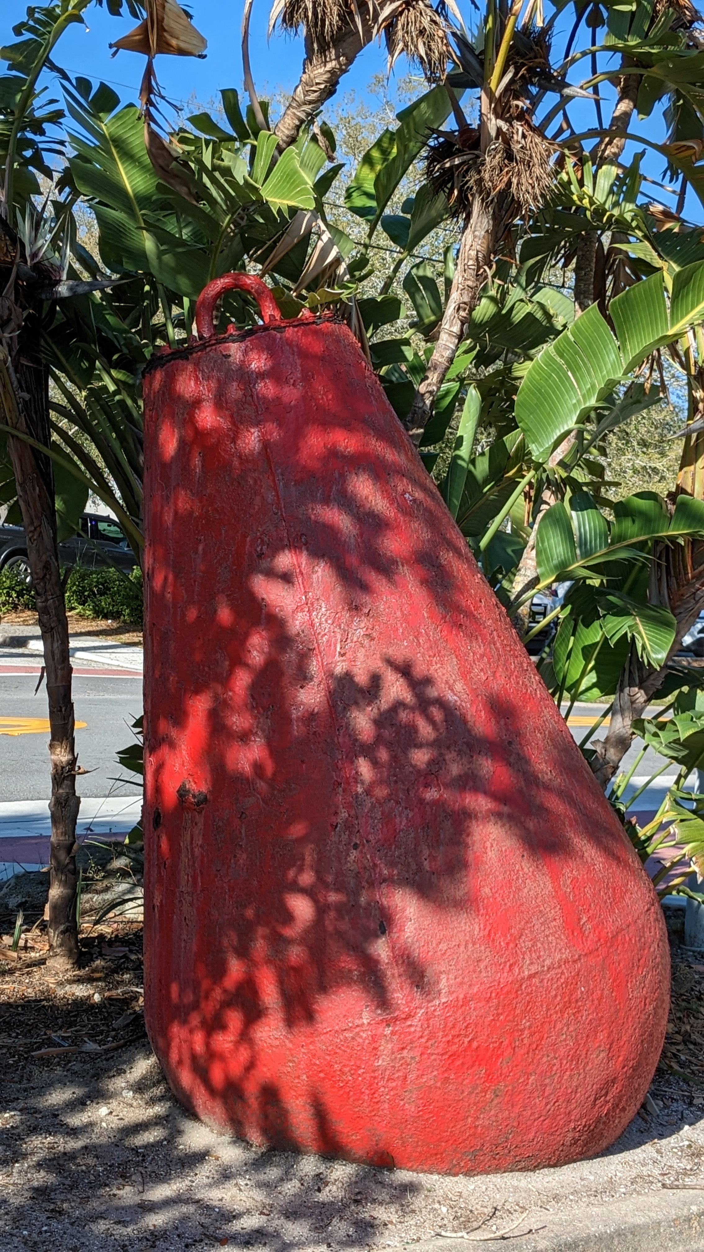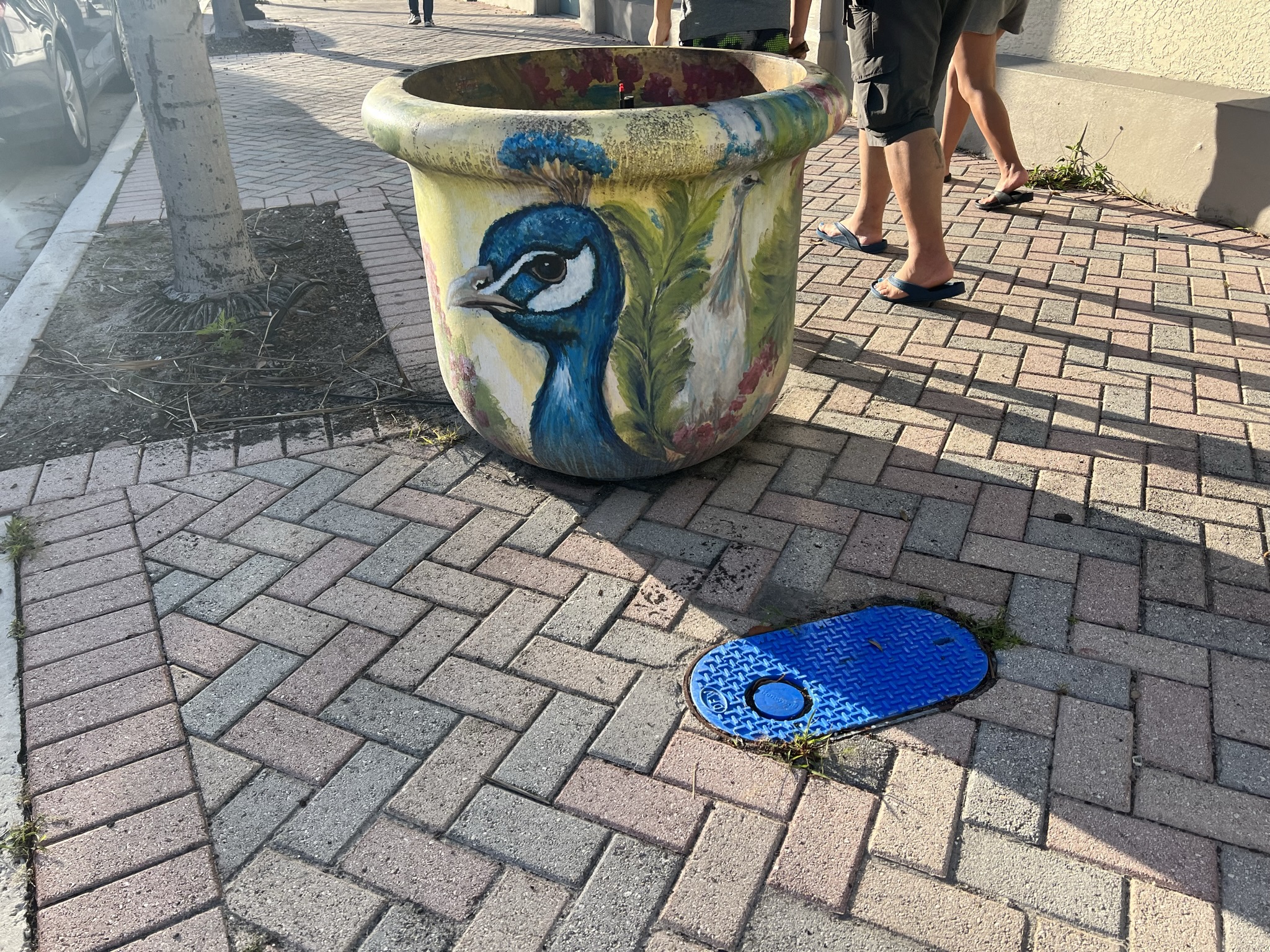 Our first stop was Fort Pierce and we dinghied over to the city marina to find a spot on their dinghy dock. We poked around the town area for a while and popped into a shop called Africa, which featured art and artifacts from Africa and a shopkeeper who called out “Welcome to Africa!” Neat to see. After a bit more walking, we happened upon some peacock crossing signs and some trash cans painted with peacocks. We figured it was a joke or town gimmick. But no, their gimmick was the real thing. There is a house called the Peacock House and around it was a lot of peacocks. Boris referred to them as effing peacocks!