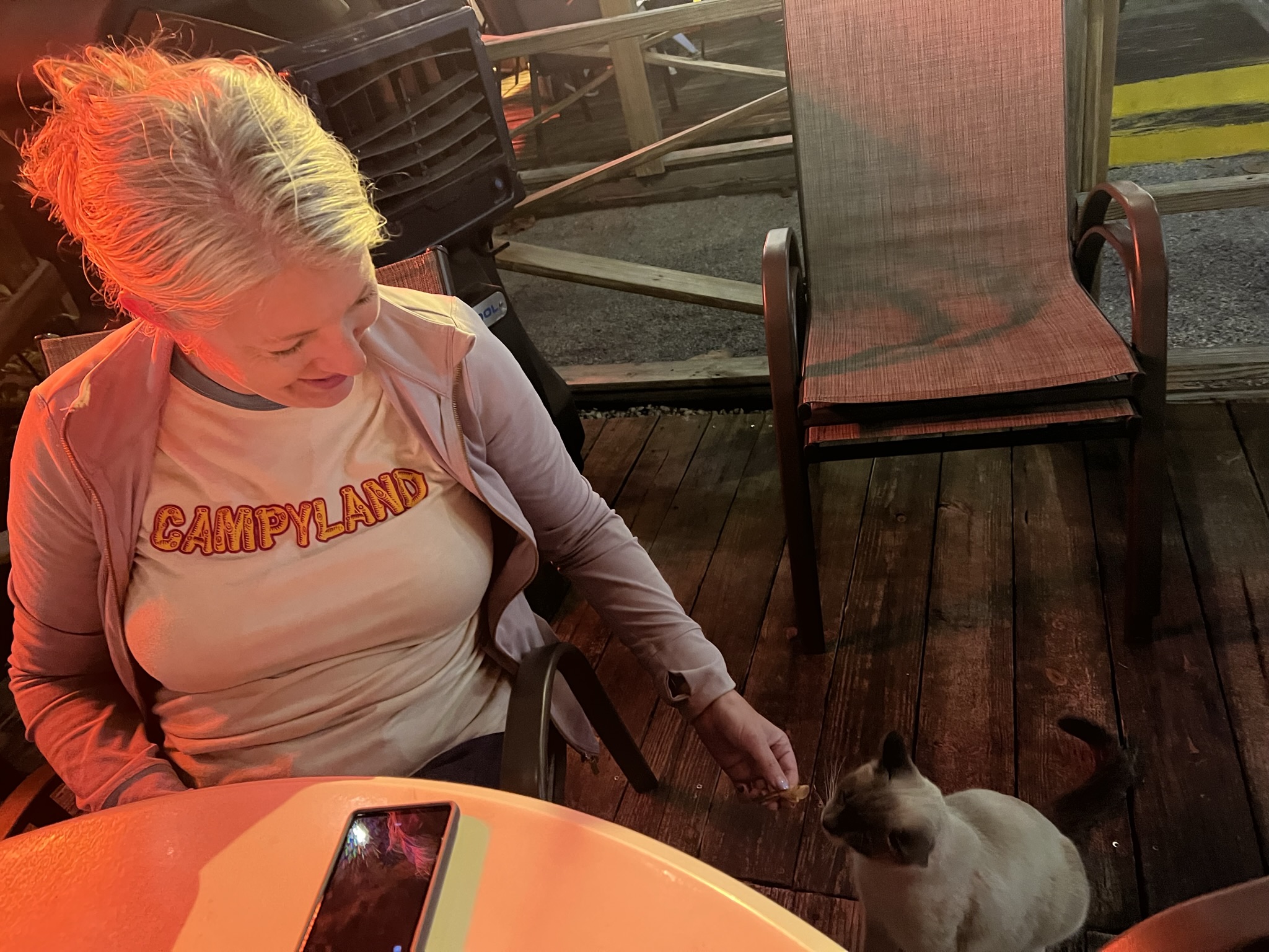 After the peacocks it was time for dinner, and we headed to a restaurant that was recommended to us by a group at our last stop. The restaurant was 12A Buoy and it was a pretty happening place. The food was wonderful! We even had one of the resident kitties join us.