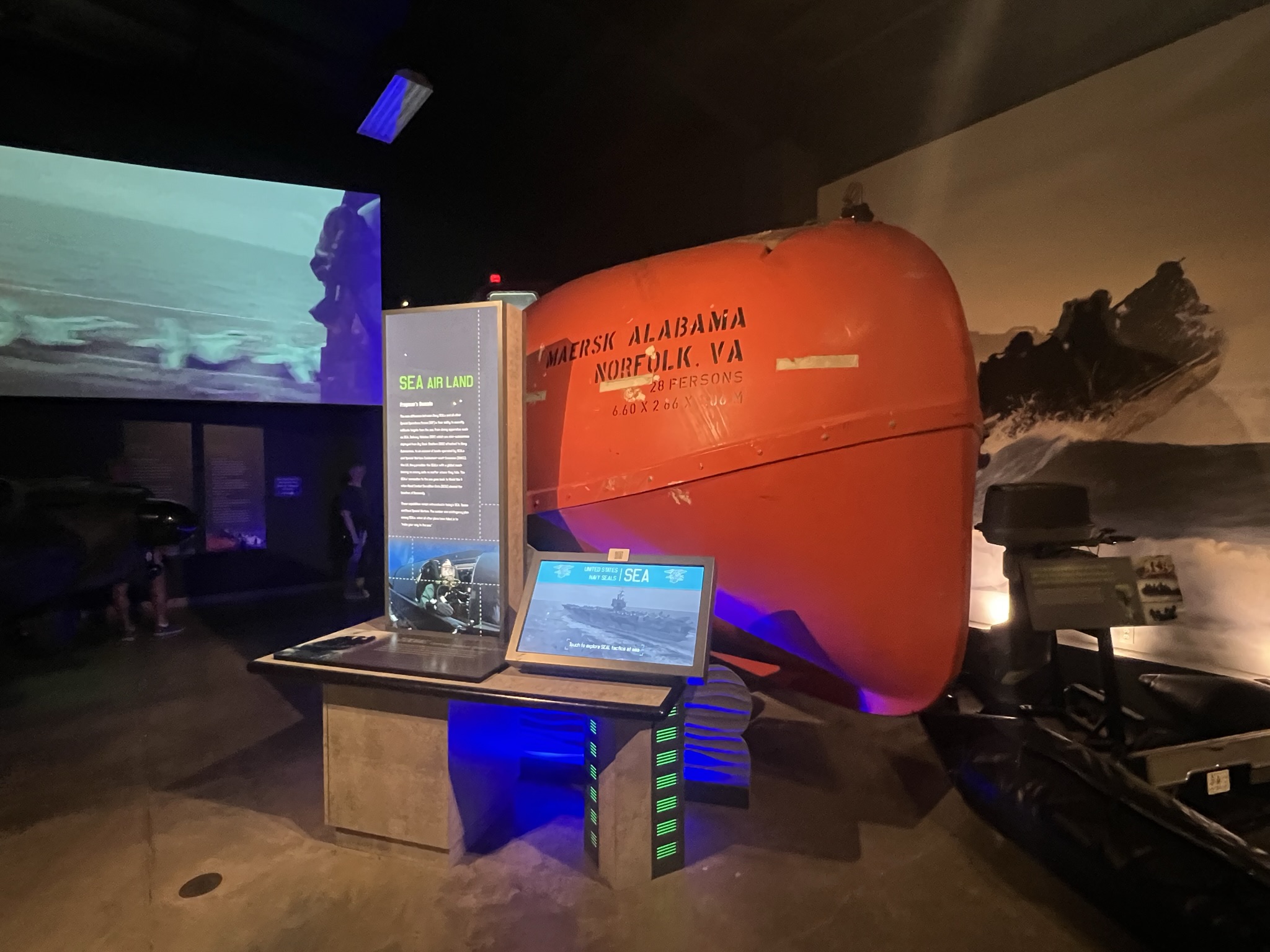 After a quick stop for lunch at a hot dog stand, we got back in the dinghy and headed over to the Navy Seal Museum. As you expect from the name, the museum is dedicated to the history and workings of the Navy Seals. It has everything from underwater delivery vehicles to interactive consoles that let you plan equipment on missions. There are a lot of displays of historic missions they have undertook. It even has the safety boat from the pirate attack. On the outside they have an actual obstacle course for people to try out. Or, in my case, hurt yourself on.