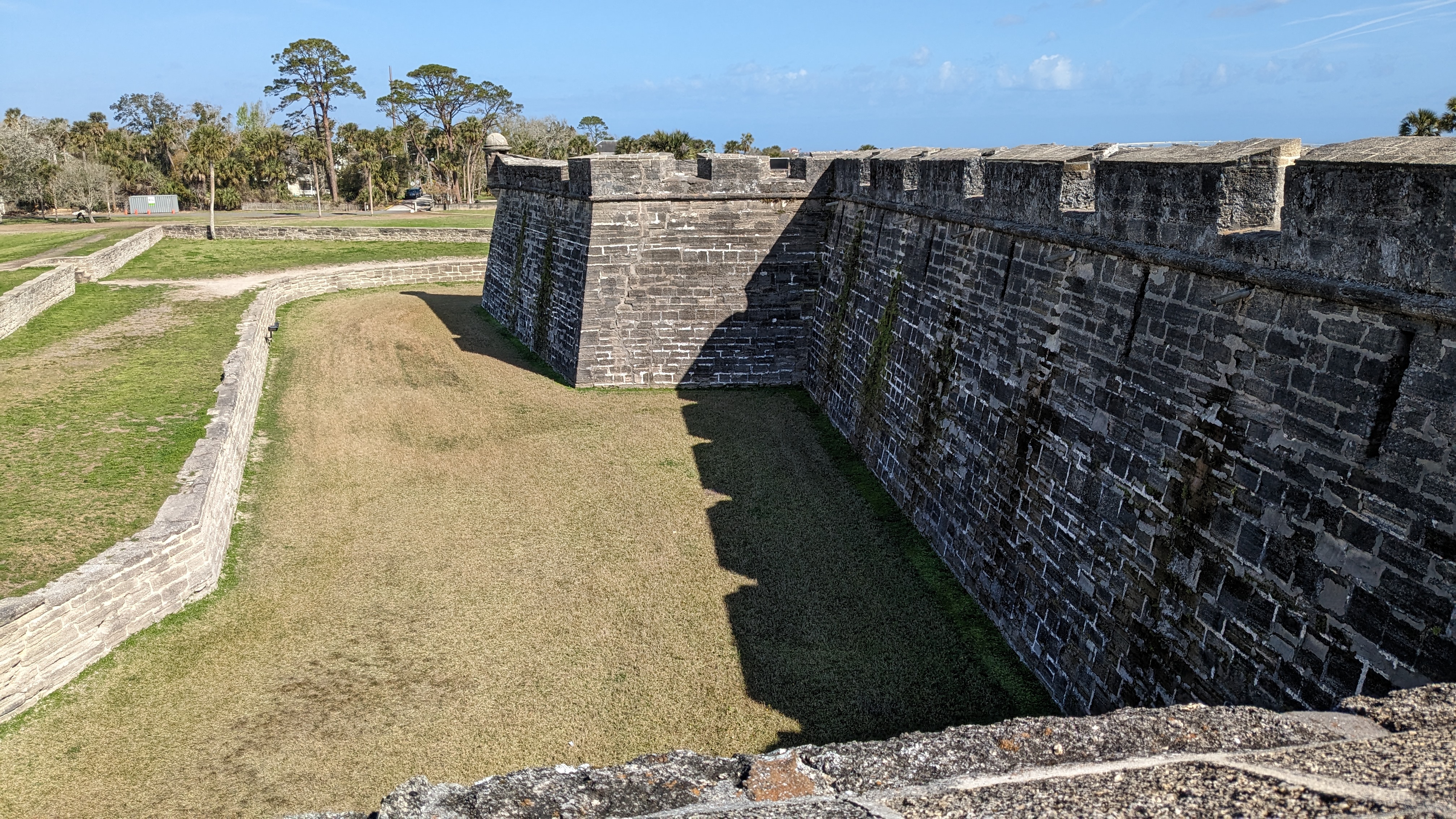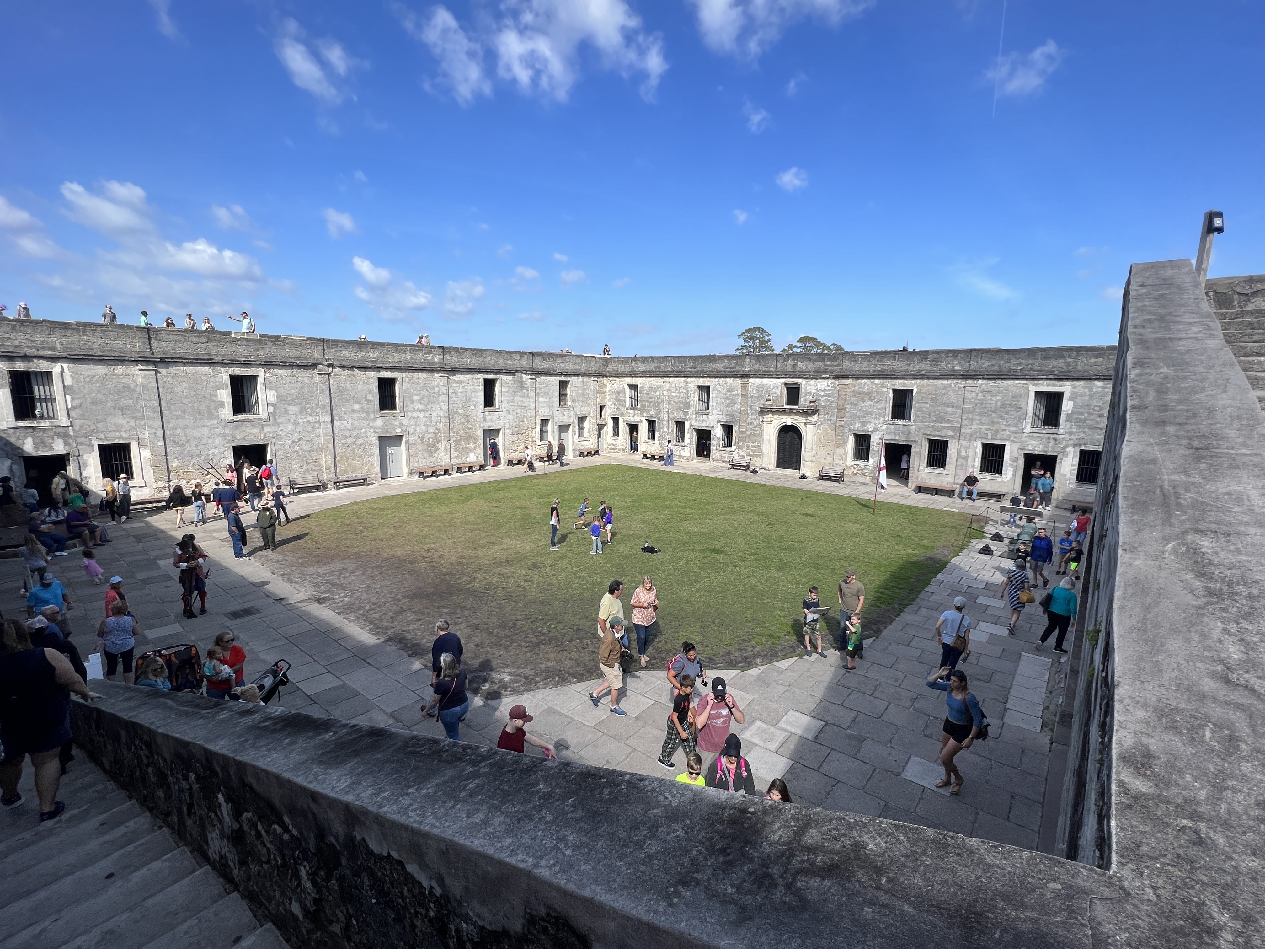 On the first full day we planned to take the hop on hop off style Old Town Trolley Tour around the historic downtown to hit the main tourist attractions. Mayli had a list! It started out as planned and we hopped on. The first stop was the Castillo de San Marcos. The Castillo is the oldest masonry fort in the U.S. The Spanish built it in 1672 to fend off the British. The fort was made from coquina—a natural resource found on the Florida coast of a limestone composed of seashells. They liked it for the fort as it wouldn’t crumble when struck by cannon balls. It would just absorb them so they could recycle the balls and send them back at the enemy.