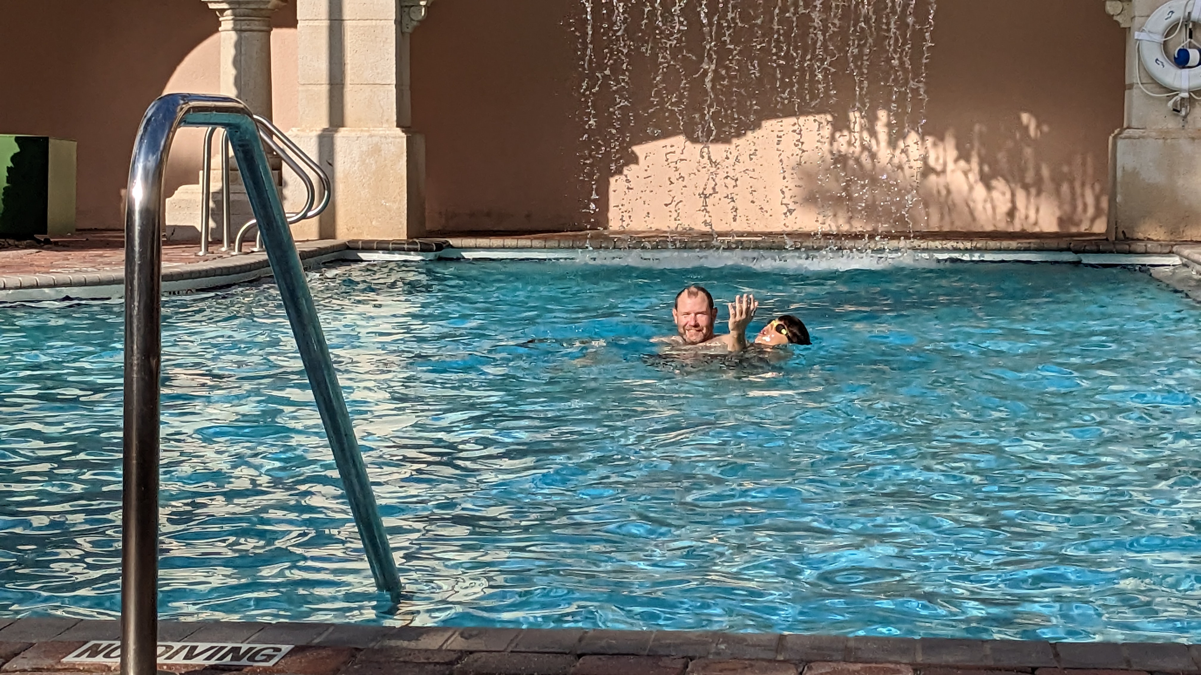 While in New Smyrna, Tonia was able to reconnect with Cindy — a colleague from her former job and a PM (passionate mom). She treated us to beignets that were especially delicious!! She likened them to the best in New Orleans so we are looking forward to this on the future stop on the trip. It was a short visit though packed with memories, catching up (she shared her grandkitty Smush), and recalling how inspirational each was to the other. At the end, Cindy took us on a brief tour of the Riverview Hotel Spa where she works with its waterfall and heated pools! Luxurious!