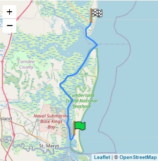 To maximize the day, we decided to get up at sunrise. That allows us to get the 4.5 hours of travel in and still have time to explore Cumberland Island. The charts showed that it was a half hour faster to travel on the outside (ocean) and the weather was good, so we headed out into the Atlantic as the sun was rising. Going on the outside in good weather is nice. The autopilot is set on straight for a few hours and there is less stress with traffic, windy rivers, and the water is much deeper.