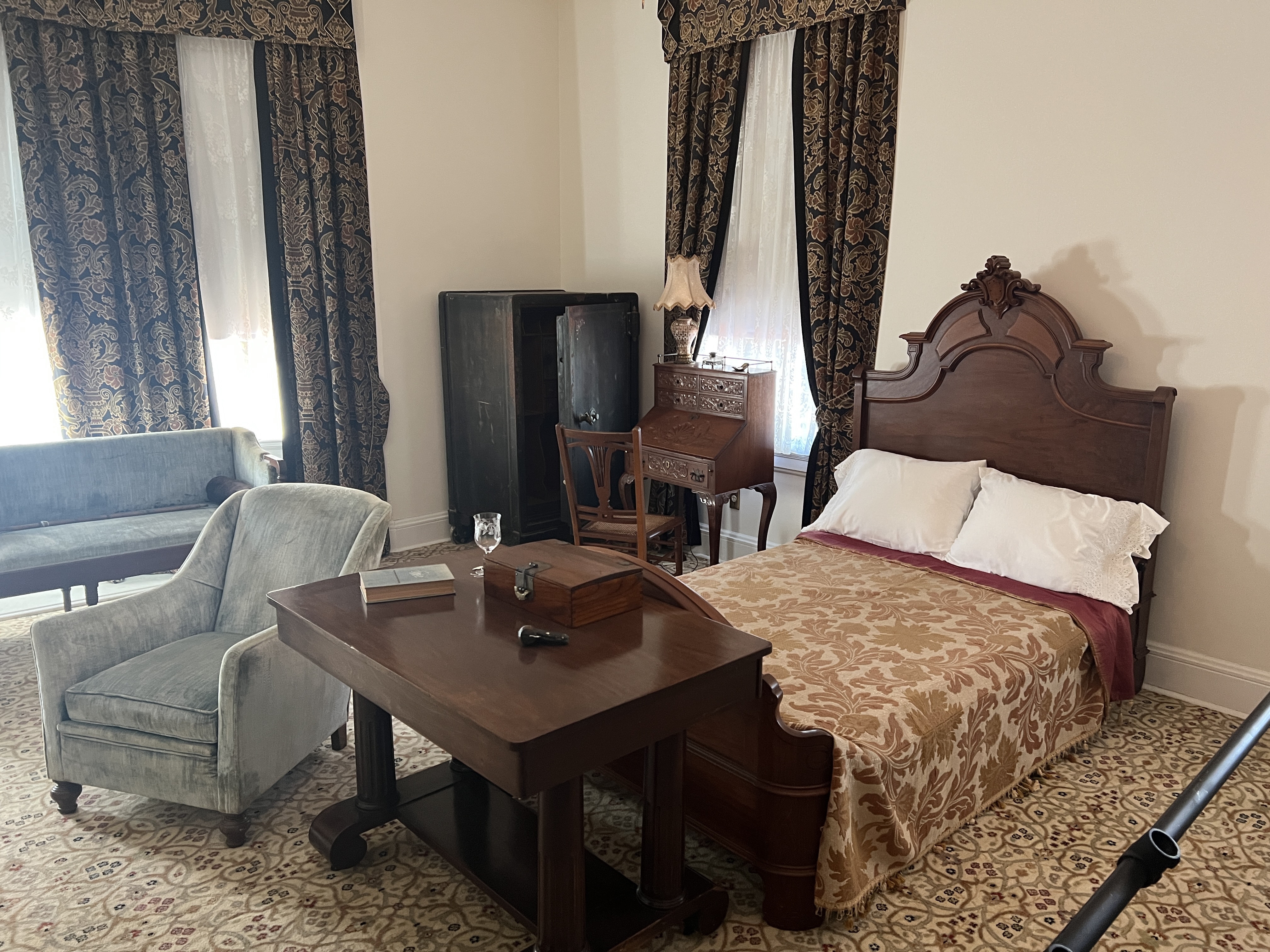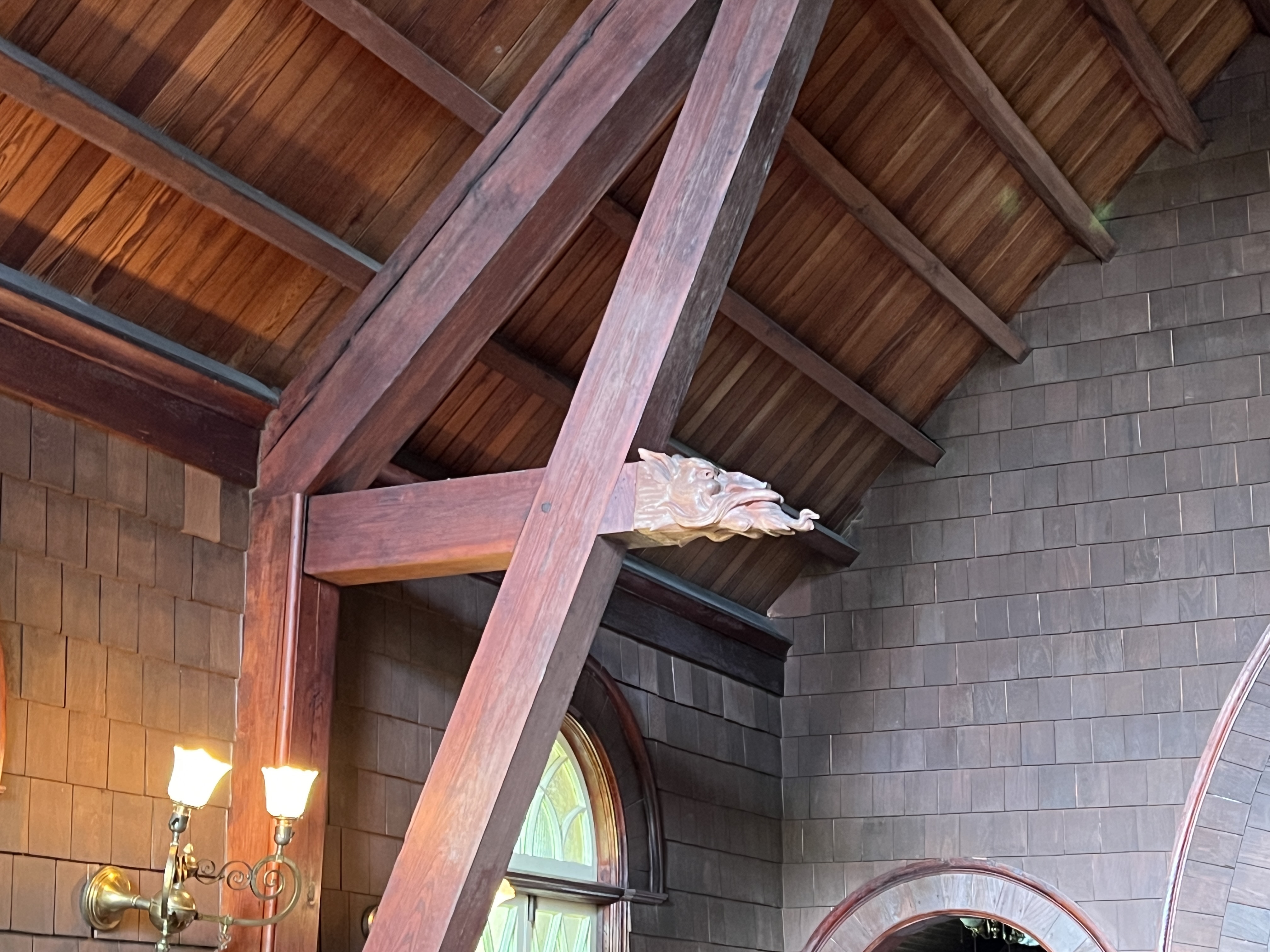We had a little buffer time before dinner so biked around a bit more and we briefly checked out the Faith Chapel, which is still in use. It was simplistic yet with a few ornate features. It has two stained glass windows – “Adoration of the Christ Child” at the front of the chapel and one at the back, the latter of which was actually commissioned and signed by Louis Comfort Tiffany, though it’s currently removed and offsite for restoration care. A neat feature were the grotesques, similar to gargoyles though on the interior beams.
