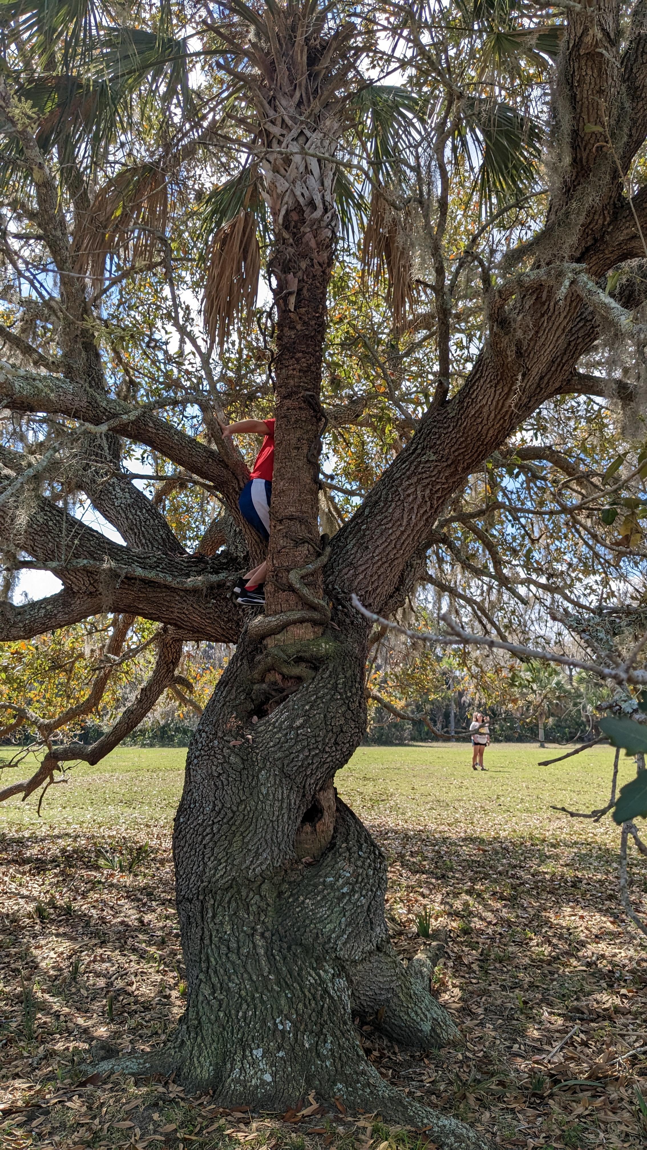 Fun side note: In St. Augustine the trolley tour guide was super excited to tell us about the palm tree growing in the middle/top of the fork of Old Senator, a 600-year-old tree and longest-living resident of the town. However, we found a live oak growing around a full-size live palm! Check it out below and find the hidden climber.