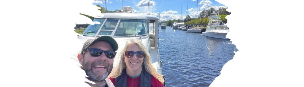 We returned to find our boat in a covered slip, which explained why it wasn’t online when we were gone – Starlink doesn’t like a roof! While we were waiting for the Hodaks to get back, we provisioned before returning the rental car and then joined other Loopers at the Atlantic Yacht Basin for a pop-up happy hour. We had a great time chatting with some former Loopers from Catsaway (notice their onboard pup). Another former Looper caught us in one of their pics too! *The last photo is from the Great Bridge of a covert-looking military vessel.