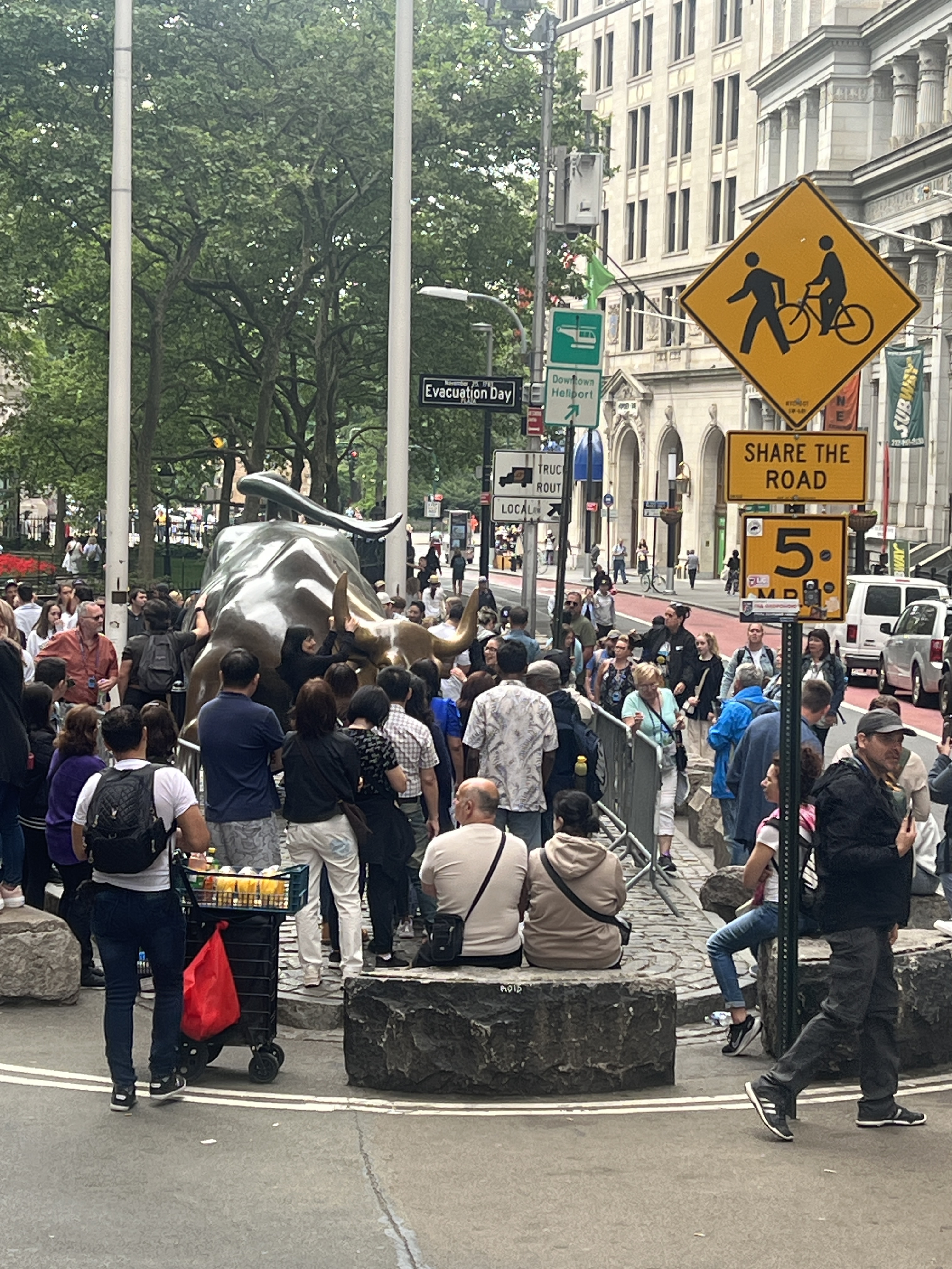 Day 5 started with NYC bagels and the Charging Bull of Wall Street on our way to the Statue of Liberty. Michael was convinced of the superstition to get good luck by touching the bull, so he stood in line to give it a rub.