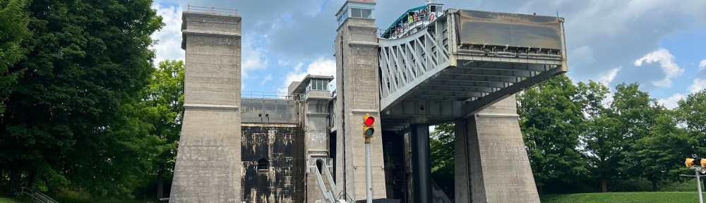 From Wikipedia: For many years, the lock’s dual lifts were the highest hydraulic boat lifts in the world, raising boats 65 ft. This was a considerable accomplishment in the first years of the 20th century, when conventional locks usually only had a 7-foot rise. It’s a very cool lock and uses gravity to move the tubs up and down. From the lock sign: “Regardless of the number of boats in the chamber, the weight in the chamber will not change. According to the Archimede’s principle of physics, a boat will displace a quantity of water equivalent to the weight of the boat.”
