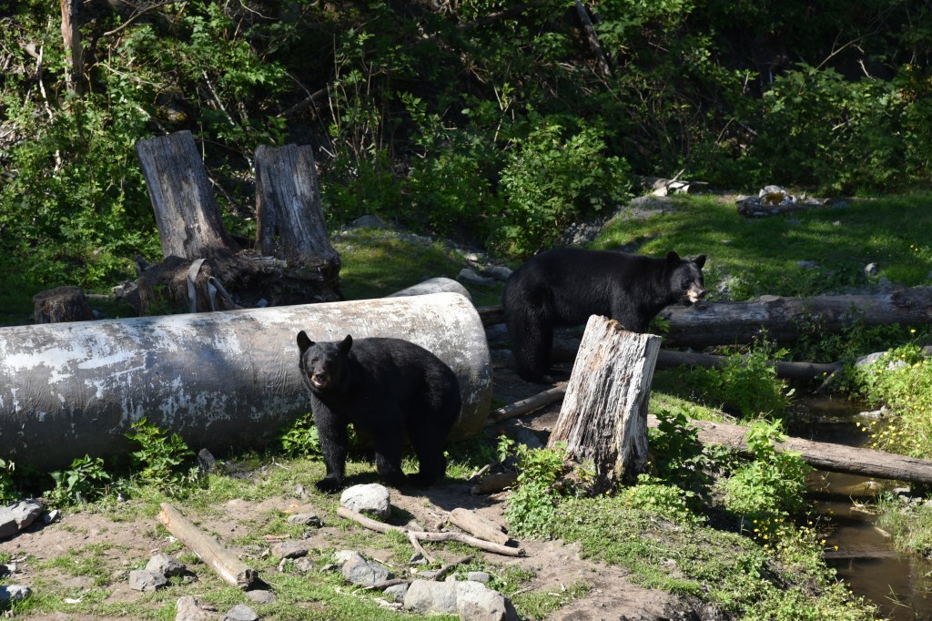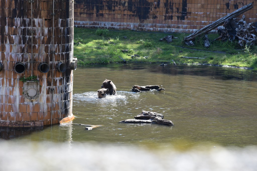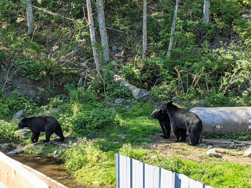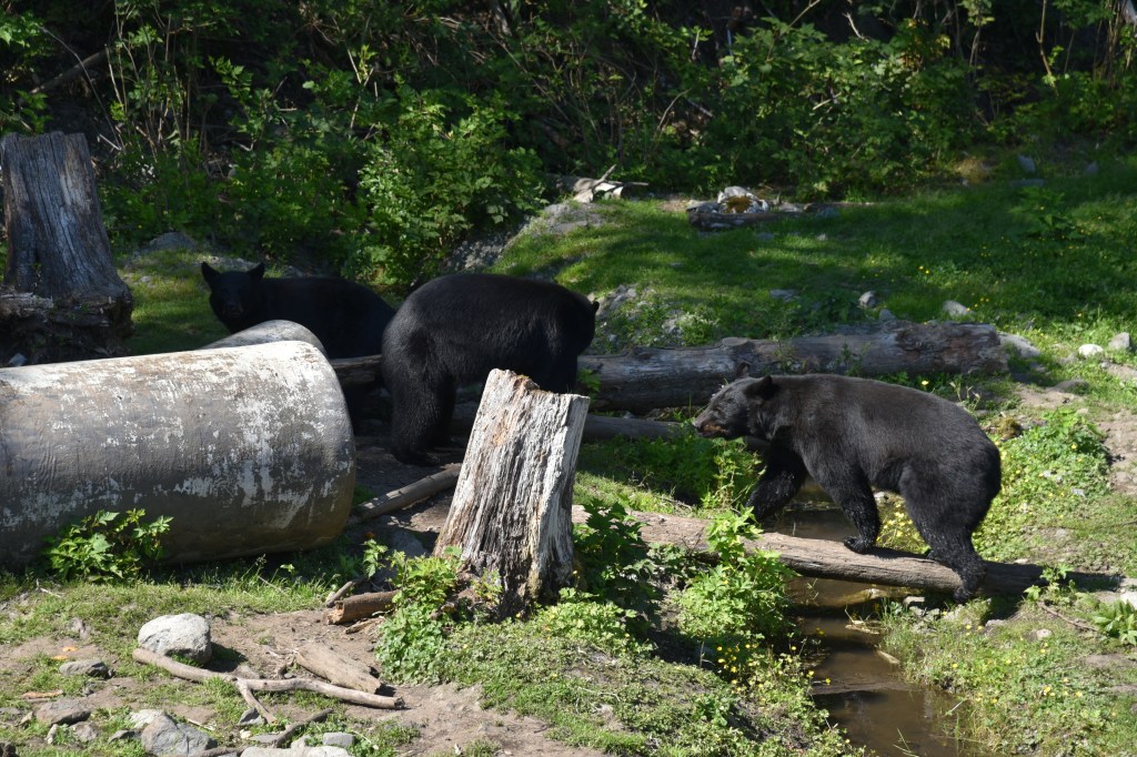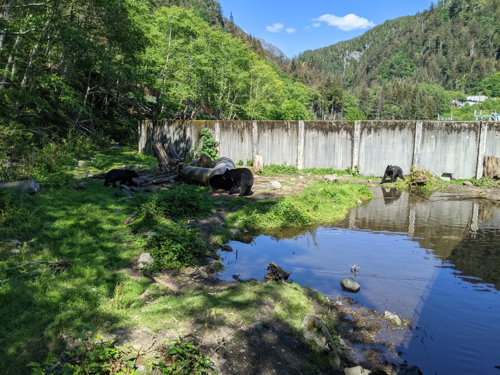 We were a bit beat after walking the park and trail, even with parts closed to bear sighting 5 days ago (see pic above), so hailed the Toad Taxi for a ride to the Fortress of the Bear, a rescue facility for cubs five miles outside of town. While a bit odd to view them in the converted waste-water treatment facility, the Alaska brown bears seemed to be having quite the good time playing in the water on this warmer day. There were three black bears ambling around too, one of which seemed to get on another’s nerves quite a bit!