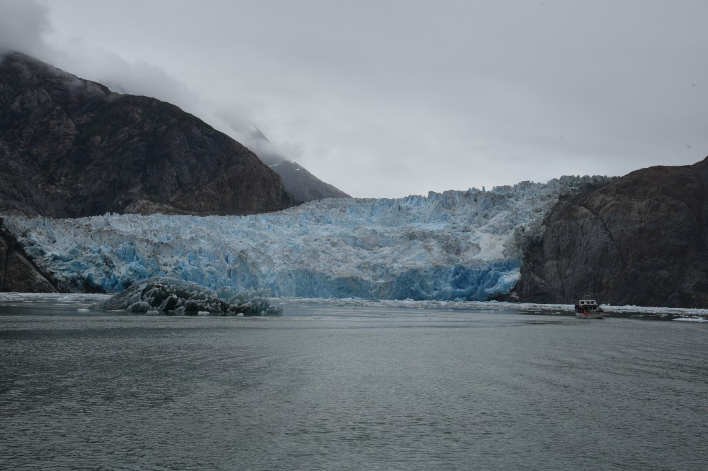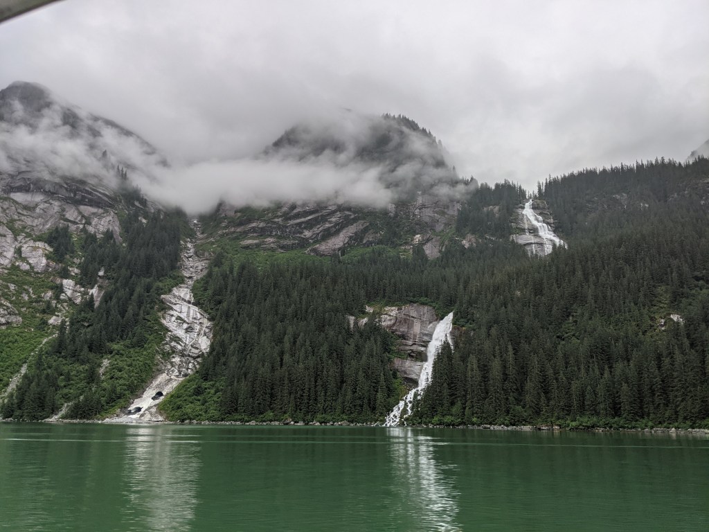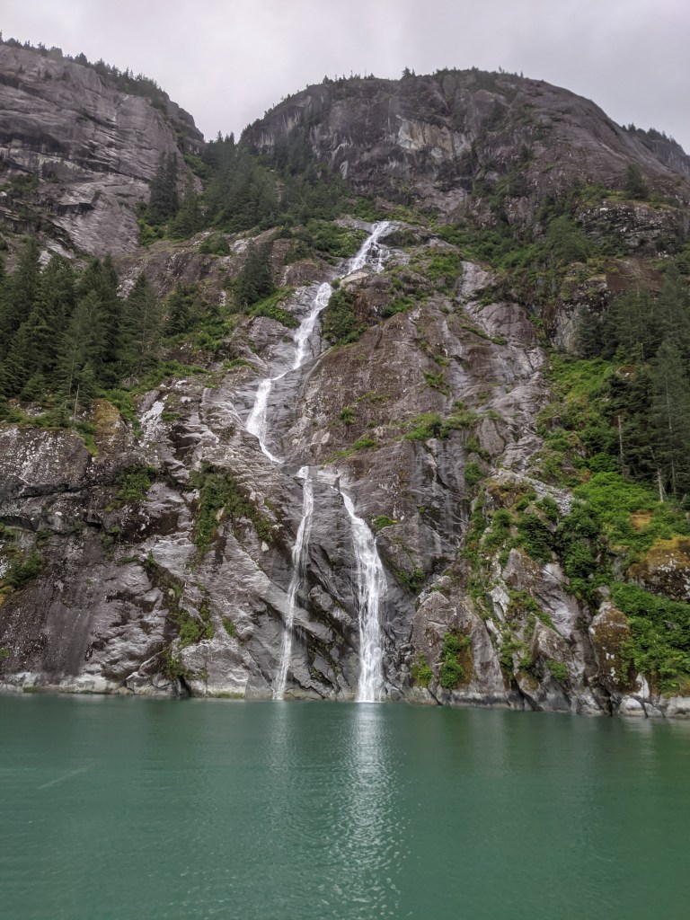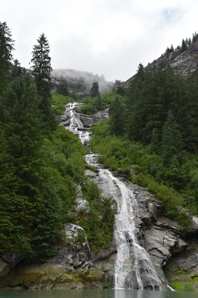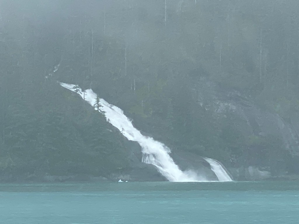 We heard many good things about the Tracy Arm, so we decided to take a full day to explore it. The day was overcast and misty. There were many more waterfalls along the way running down the steep hillsides to the green-blue water dotted with floating icebergs flowing down the arm from the glacier. We reached the end with the Sawyer Glacier and its deep blue hues and craggy peaks. There were many seals dotting the floating ice at the bottom of the glacier. It was truly awe-inspiring to see and photos again donβt seem to do it justice.