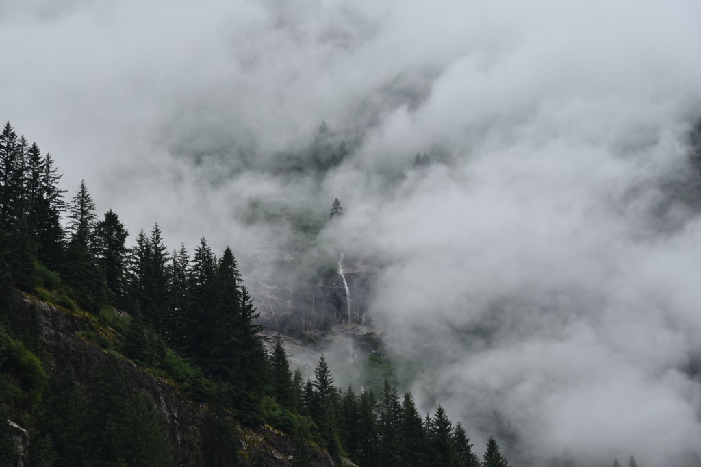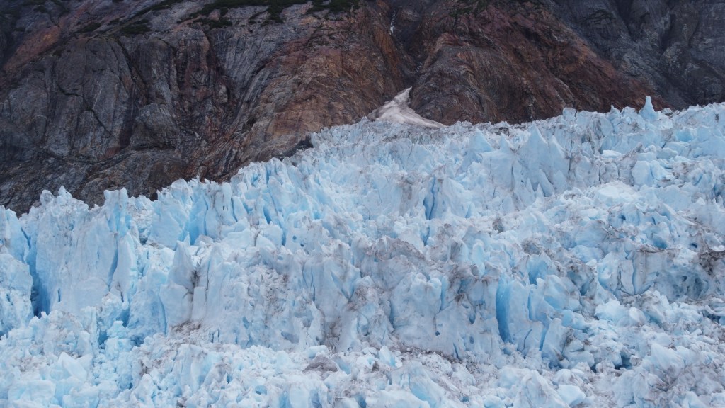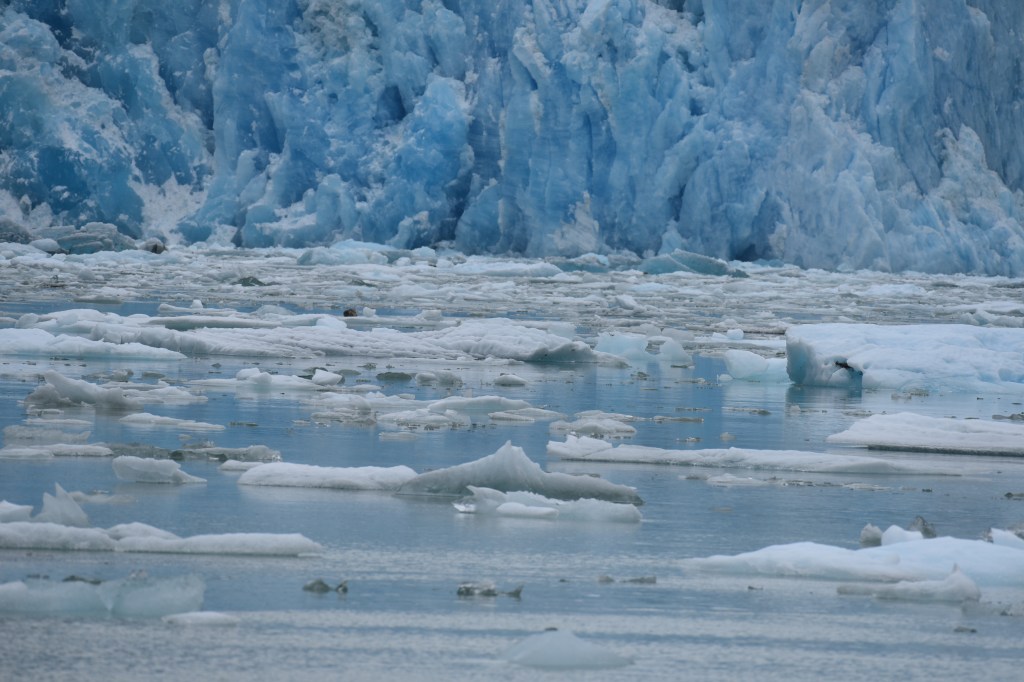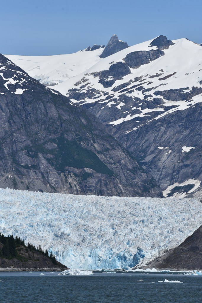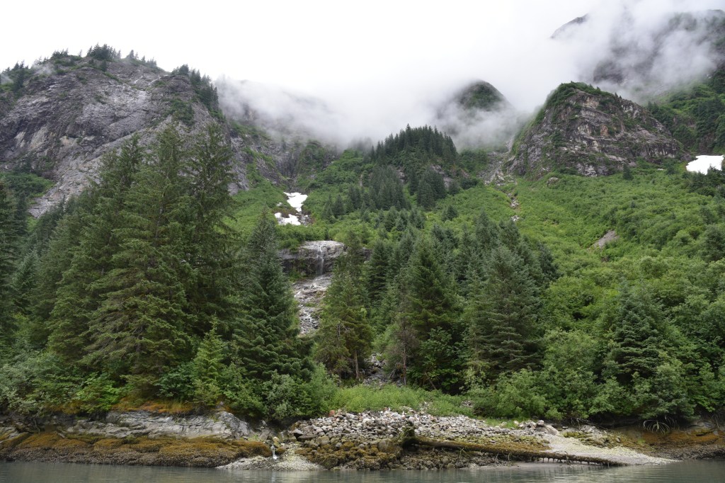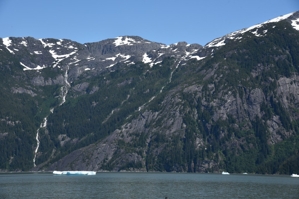 We heard many good things about the Tracy Arm, so we decided to take a full day to explore it. The day was overcast and misty. There were many more waterfalls along the way running down the steep hillsides to the green-blue water dotted with floating icebergs flowing down the arm from the glacier. We reached the end with the Sawyer Glacier and its deep blue hues and craggy peaks. There were many seals dotting the floating ice at the bottom of the glacier. It was truly awe-inspiring to see and photos again donβt seem to do it justice.