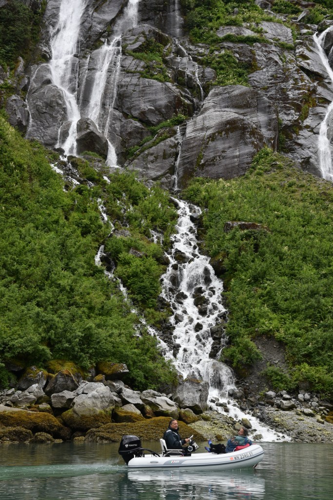 The area inside Fords Terror is amazing. Great waterfalls and an overall awesome experience. The anchorage is rather deep being in the 90-foot range. We sent Tonia and Christian off in the dinghy, and they set a stern anchor in the mud flats with some finagling and resetting to reach Codaβs stern line. The bugs were not friendly but Christian was quite the trooper! We set a second anchor off the front, and we were set in our 3-boat raft.