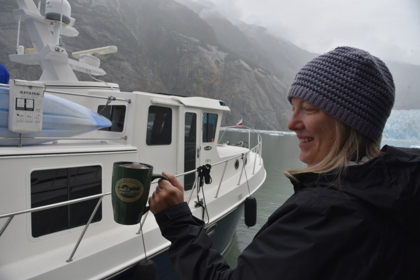A nice treat was when Coda saddled up with fenders down to hand over a hot cup of cocoa for Tonia who stood in the rain on the bow with her beverage keeping her warm. Couldnβt have it any better!